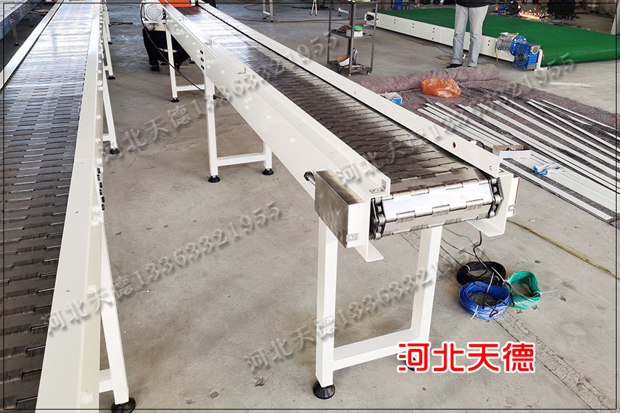 1)板鏈?zhǔn)窖b配流水線(鏈板輸送機(jī))特點:承載的產(chǎn)品比較重,和生產(chǎn)線同步運行,可以實現(xiàn)產(chǎn)品的爬坡;生產(chǎn)的節(jié)拍不是很快;以鏈板面作為承載,可以實現(xiàn)產(chǎn)品的平穩(wěn)輸送。