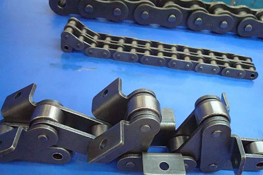 2. 對于彎板滾子鏈:粉塵、豆粕、麩皮以及糧食輸送過程中的小塊顆粒易于附著在滾子上,會嚴重影響滾子的壽命,致使彎板滾子鏈的使用壽命降低,從而增加生產成本并造成安全隱患。此種鏈條適用于輸送較清潔且附著能力弱的物料。