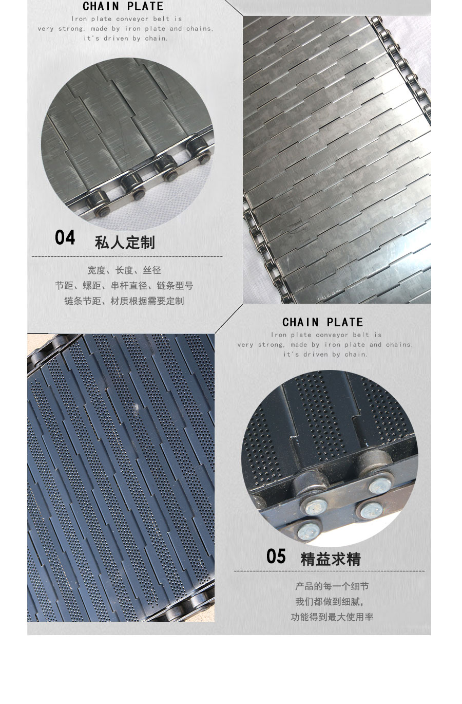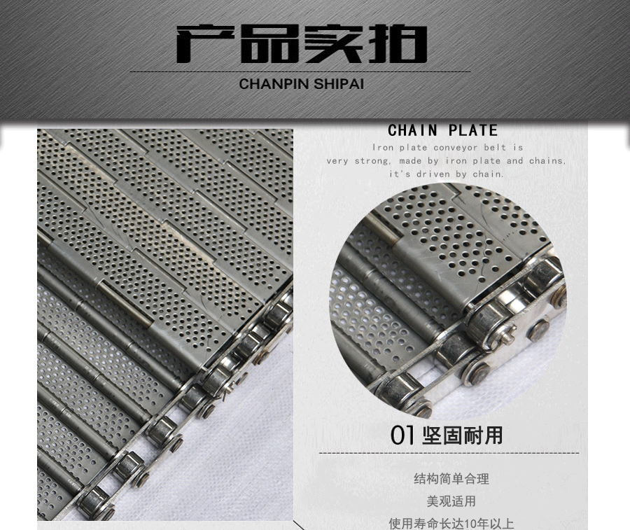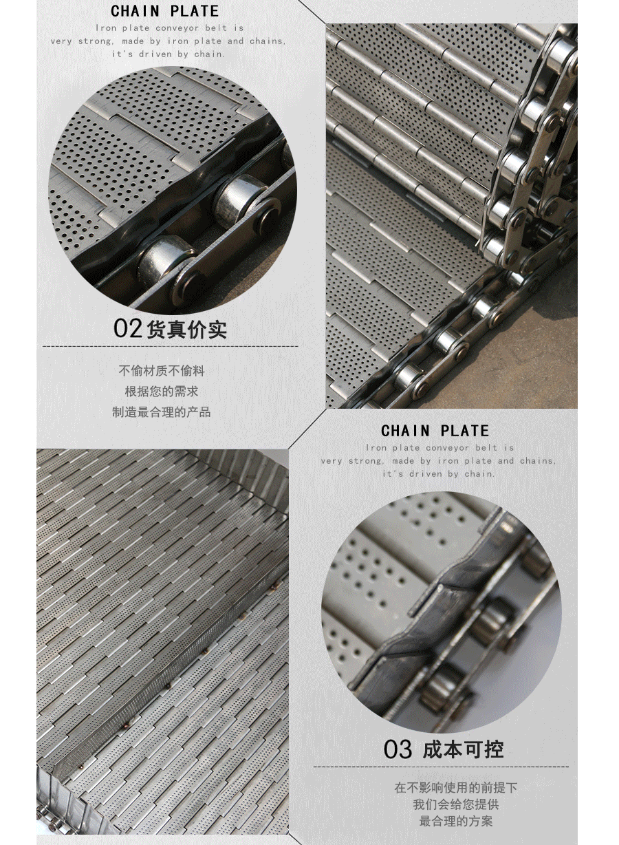 鏈板輸送帶:是采用不銹鋼板沖壓成型,鏈條傳動,每節由6-10mm支撐桿連接,其運動平穩、力量大,適合用于輸送細小的高密度物件,輸送過程中運轉平穩,安裝更換方便,成本高,使用壽命較長。