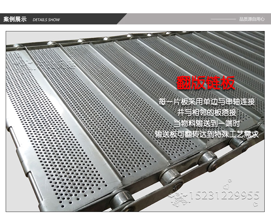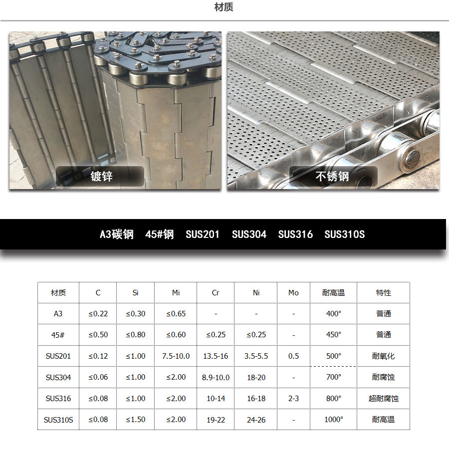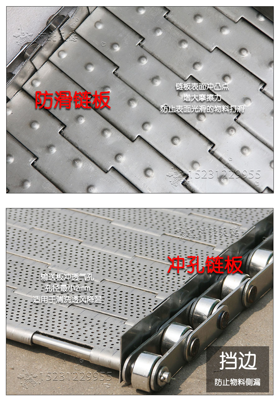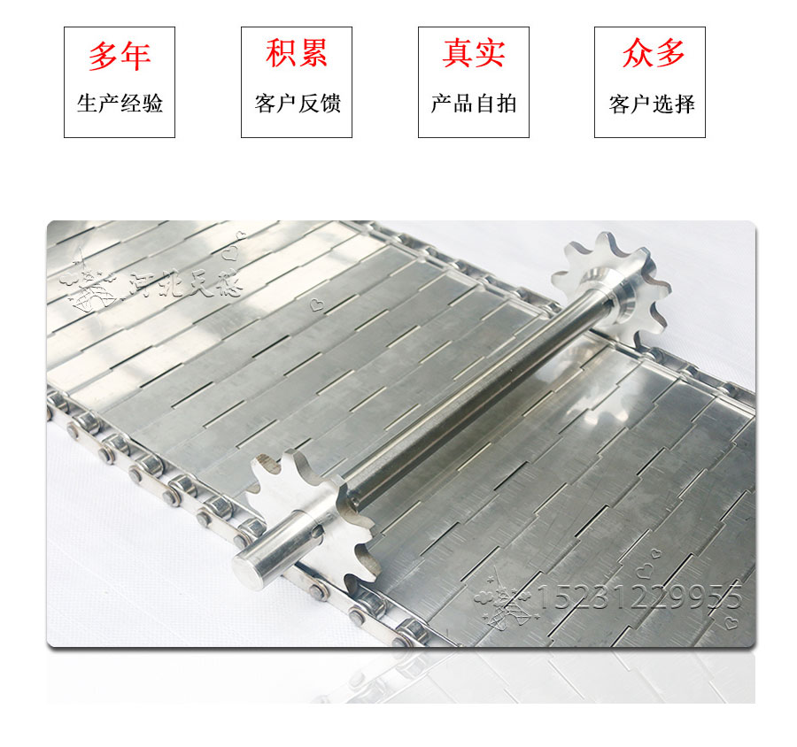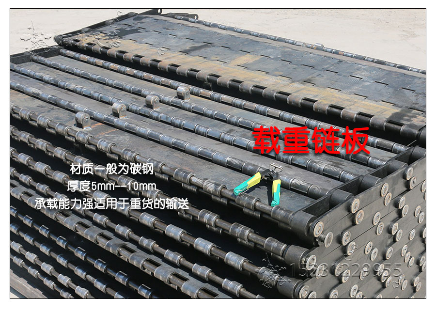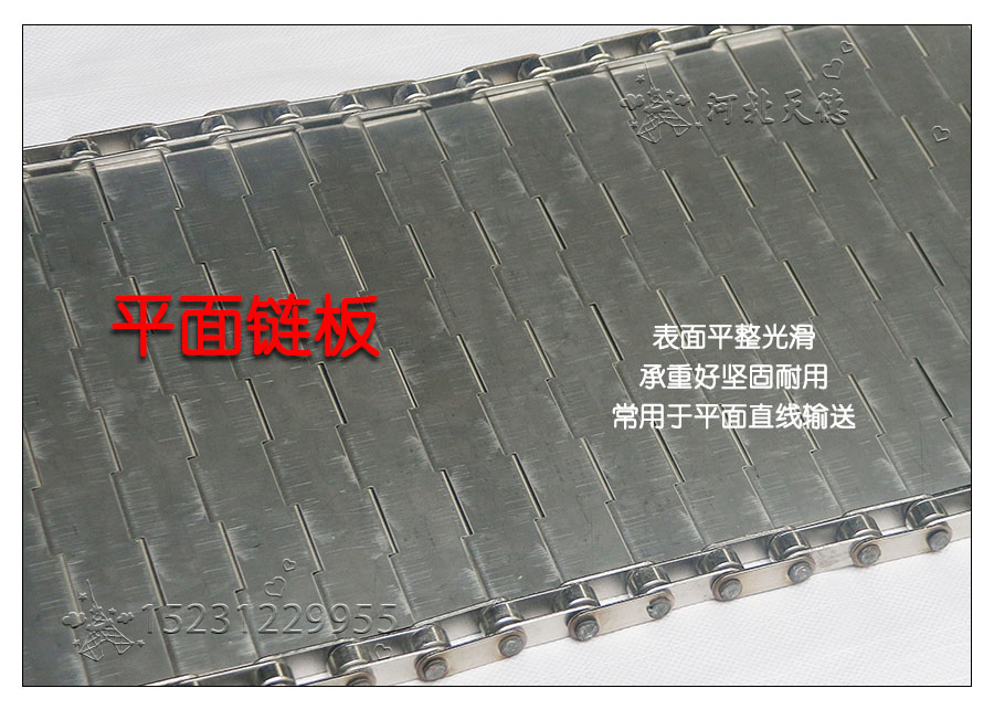 輸送鏈板非常堅固由鏈條驅動采用金屬板材生產,適合用于輸送細小的高密度物件,輸送過程中運轉平穩安裝更換方便,成本相對較高使用壽命較長用于中等和大負荷輸送。鋼板彎曲形成合葉,使用支軸將合葉和鏈條串在一起。兩端的鏈條可以使用開口銷或者墊圈來固定,使用開口銷方便拆卸,維護方便。