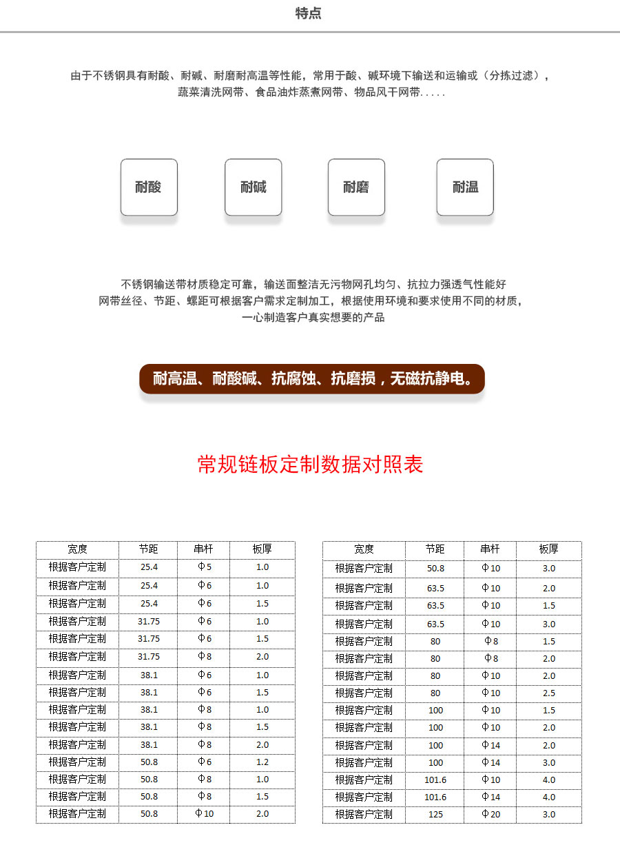天德溫馨提示:輸送鏈板是定制產品,規格及報價會根據板厚、節距、串桿直徑、材質、寬度、長度來計算,親 也可以告訴我們使用要求、應用環境、每米載重量,由我們來幫您推薦定制數據,盡力做到定制的產品即夠用也不浪費。