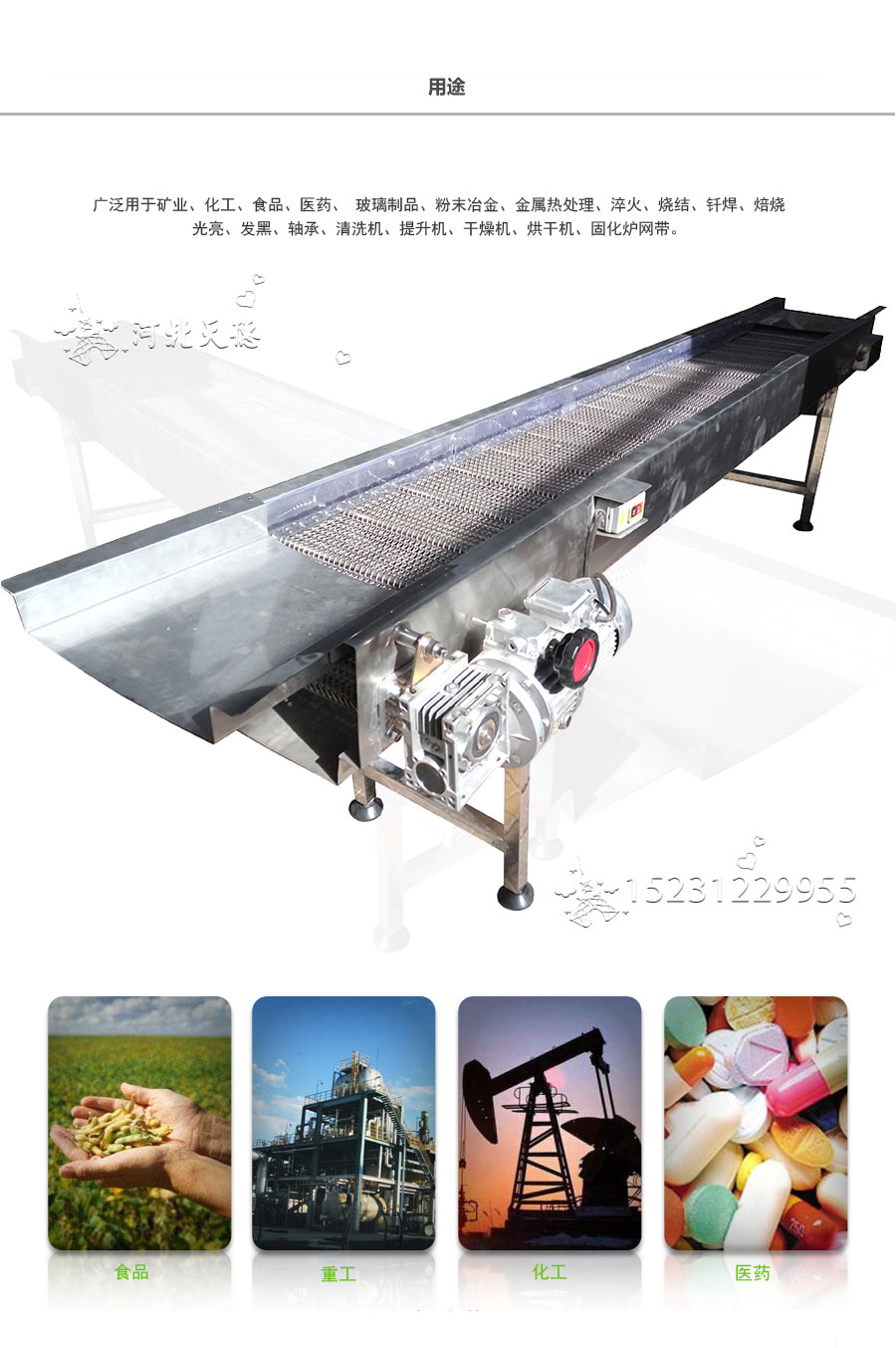 廣泛用于玻璃制品行業的退火爐網帶、烤花爐網帶等。食品加工行業、脫水蔬菜、速凍食品單凍機前處理網帶、鏈網。粉末冶金、金屬熱處理、淬火、燒結、釬焊、焙燒、光亮、發黑、軸承、滲碳高溫爐網帶、擋板式網帶、涂裝烘干線輸送網帶、泡沫鎳還原生產線網帶,清洗機、提升機、干燥機、烘干機、固化爐網帶。