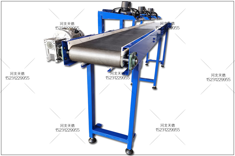 這臺設備的長度為4米,輸送機寬度為500毫米,輸送帶寬度為400毫米,機架采用碳鋼烤漆,顏色為藍色,人字輸送帶材質為不銹鋼304材質。不銹鋼材質耐高溫耐腐蝕適合輸送食品。